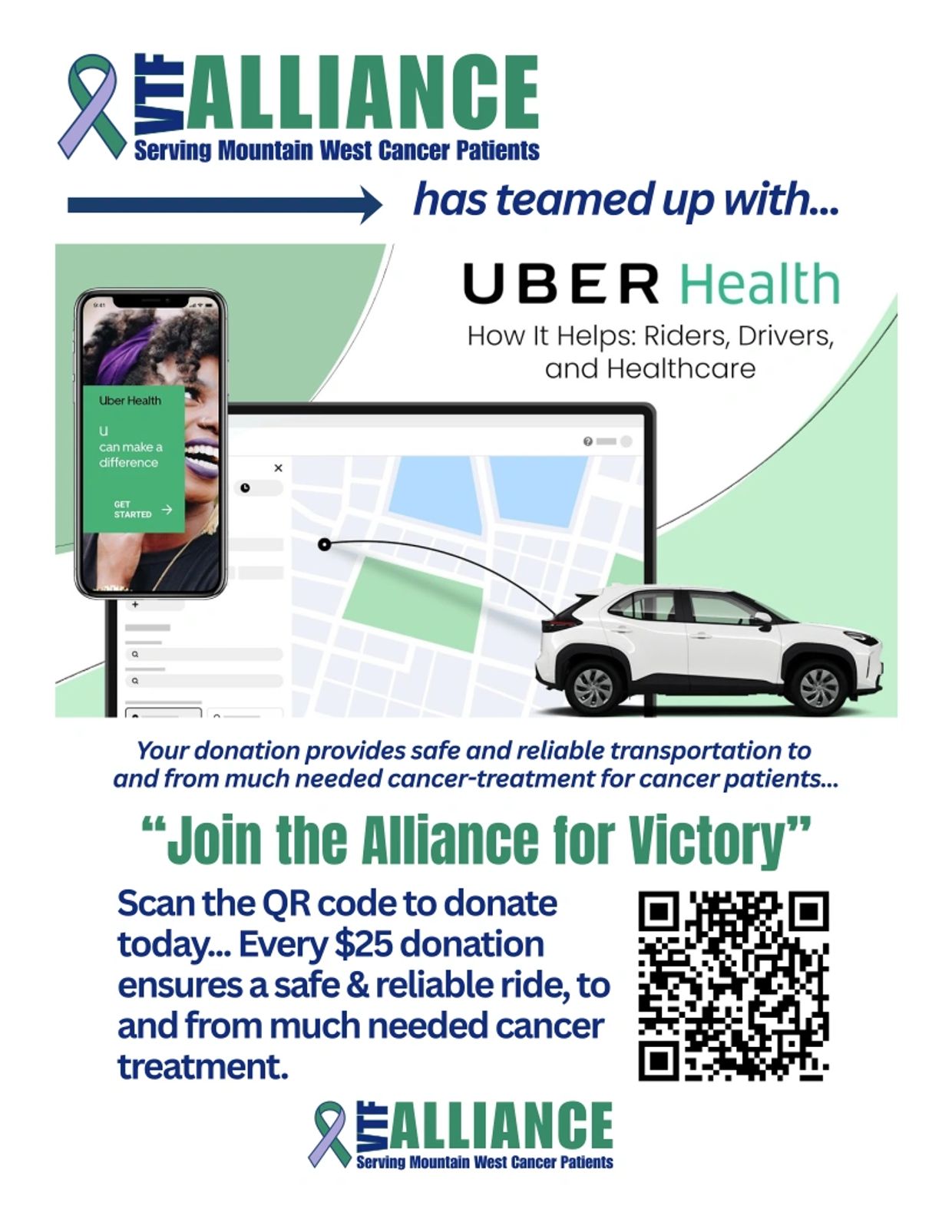 VTF Alliance's "Victory Rides" program provides transportation to and from treatment for people with cancer who do not have a ride or are unable to drive themselves. If you are or know someone facing cancer and need a ride to treatment, fill out the form below with contact information and to find out about VTF Alliances "Victory Rides" program available in your area.